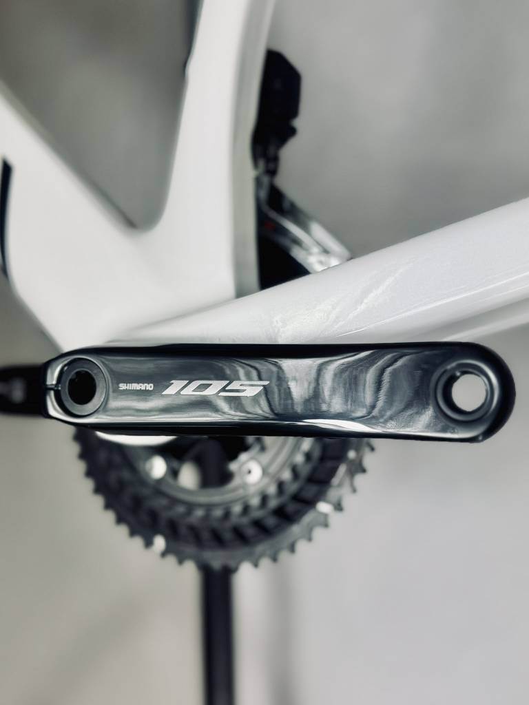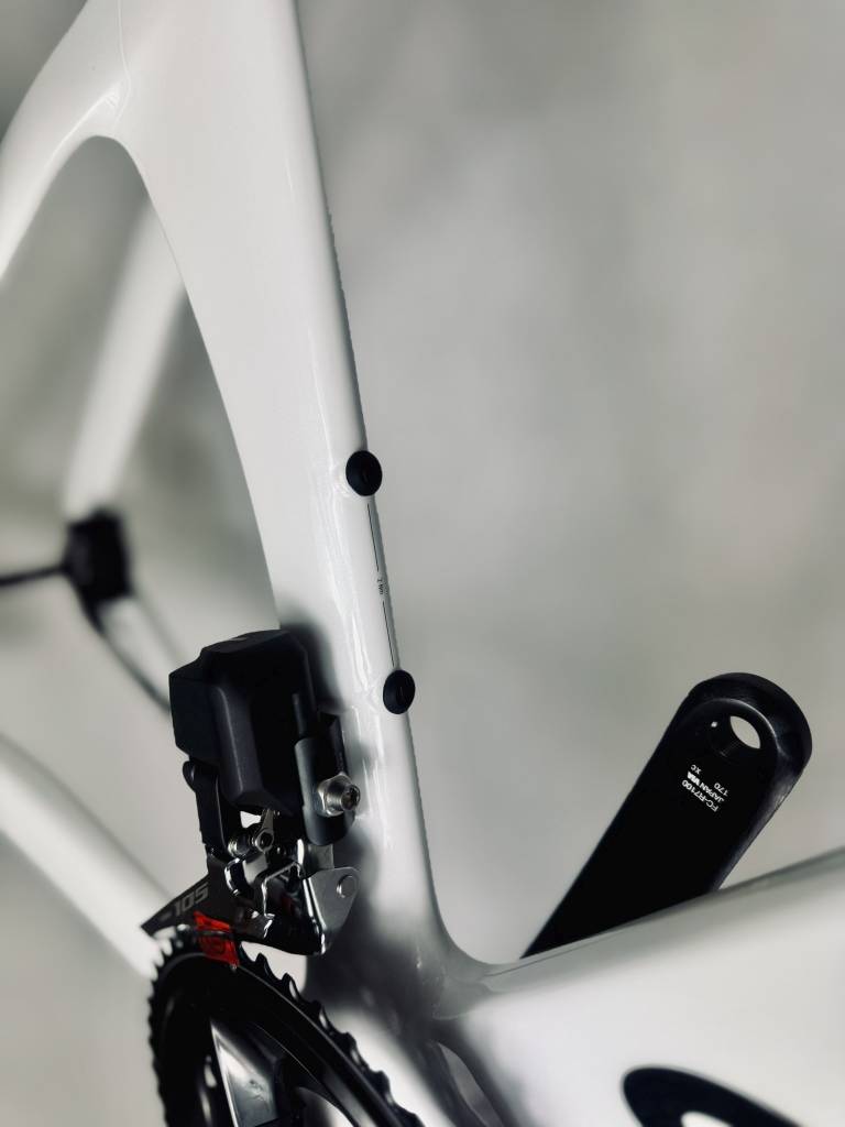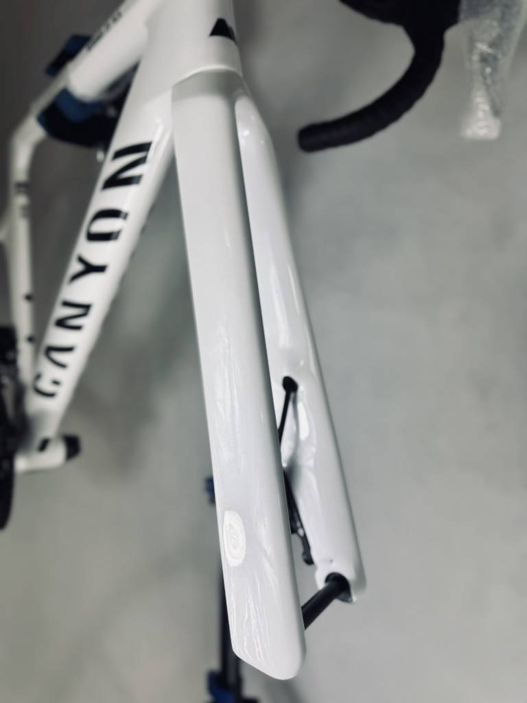 Rama Canyon Aeroad CF SLX została w pełni zabezpieczona błyszczącą folią Gloss PPF, zapewniając trwałą ochronę i efektowny połysk. Kierownica oraz korba również zostały oklejone, a wszystkie łączenia folii precyzyjnie pokrywają się z naturalnymi liniami roweru, podkreślając jego aerodynamiczny charakter. Całość idealnie wpisuje się w filozofię marki Canyon, która od lat stawia na bezkompromisową jakość.